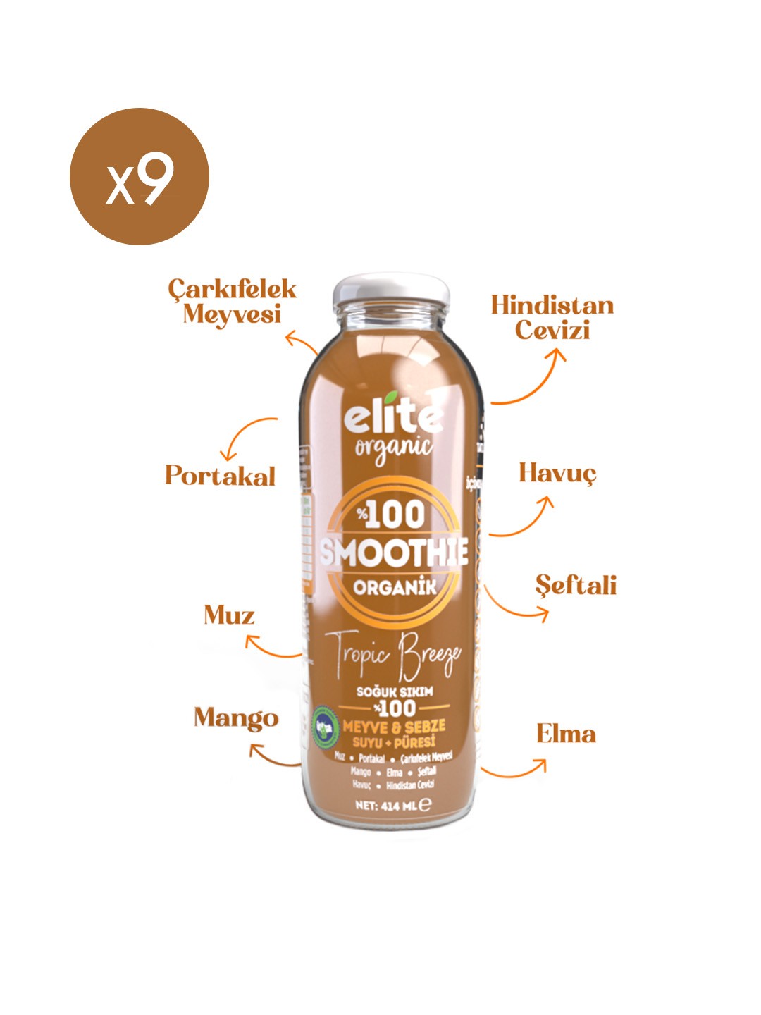 Elite Organic Smoothie Tropic Breeze, tropik meyvelerin ve sebzelerin eşsiz lezzetini bir araya getirerek %100 organik sertifikalı içeriklerle hazırlanmıştır. İlave şeker, katkı maddesi, renklendirici veya koruyucu içermez.