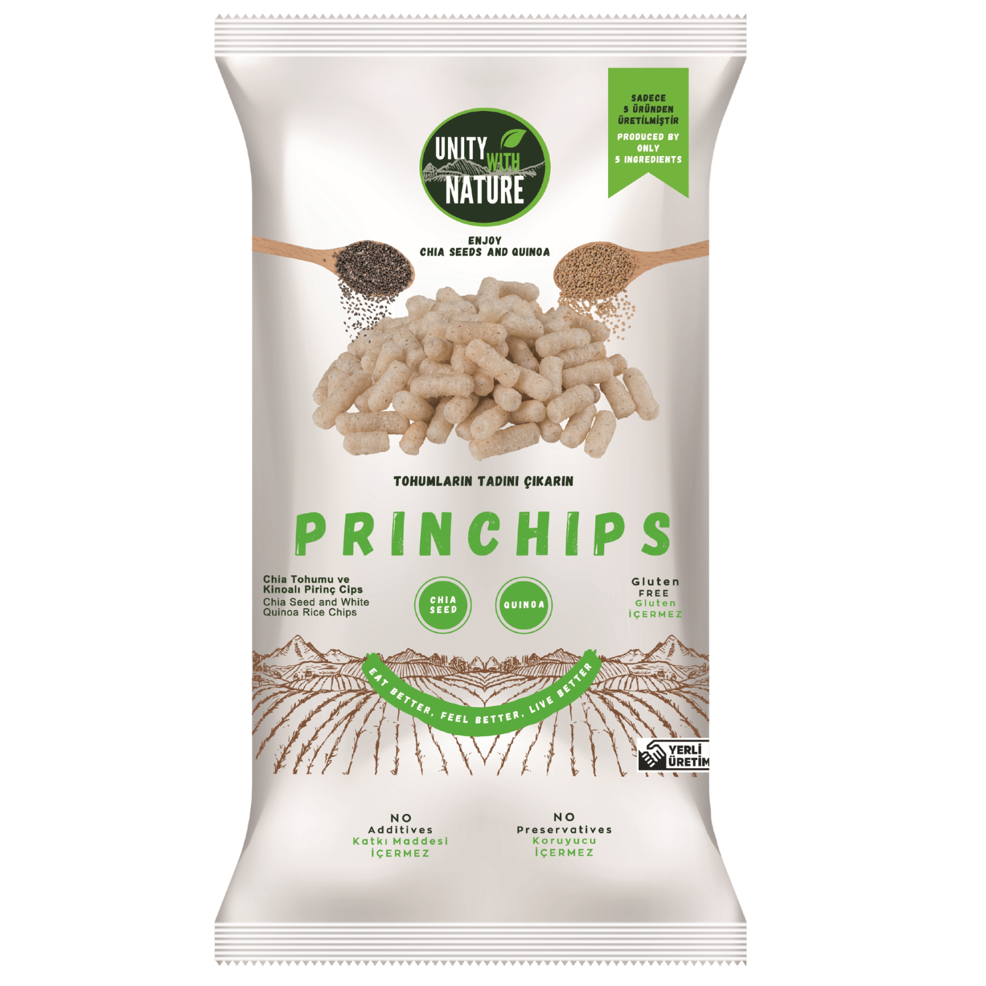 Katkı yok, Koruyucu yok, Gluten yok, Kızartılma yok. Keyifli anları pişmanlığa çevirmeyecek sadece 5 içeriğe sahip PRINCHIPS'te, Pirinç, Kinoa, Chia Tohumu, Ayçiçek Yağı ve son olarak Kaya Tuzu var ve başka bir şey yok. Yerli olarak üretmesi bizden, tohumların tadına varmak sizden. Keyifle tüketilsin diye, Let's unite with Nature.