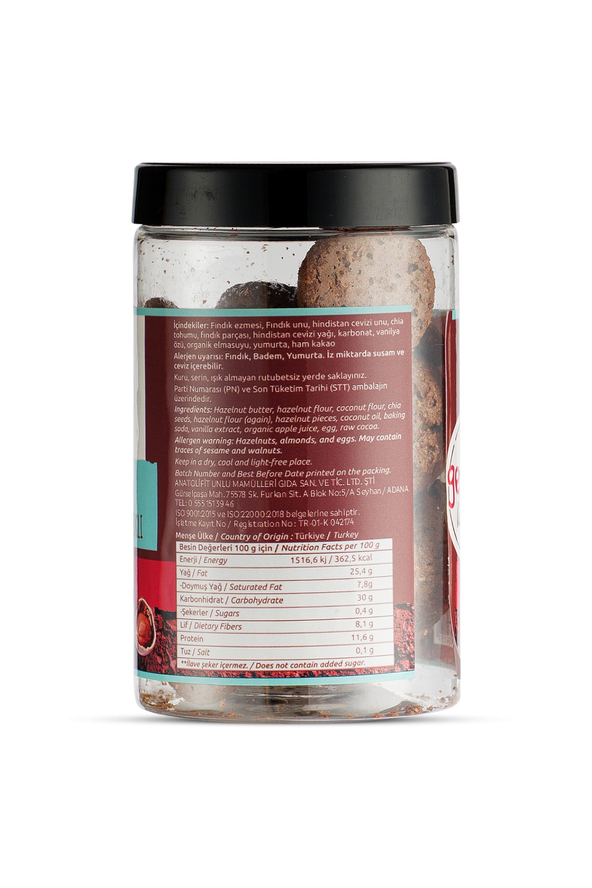 Getfit Ham Kakaolu Fındıklı Kurabiye, fındık ezmesi, fındık unu, ham kakao ve chia tohumu ile hazırlanan; glutensiz, rafine şekersiz ve katkısız, sağlıklı bir ara öğün alternatifidir.
