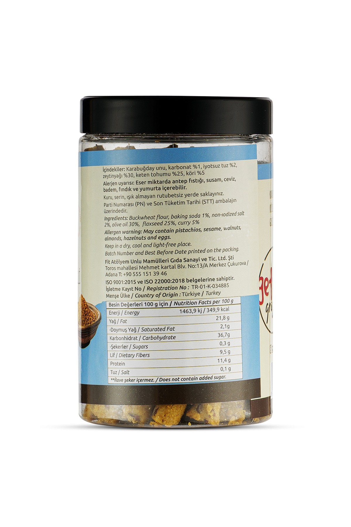 İçindekiler: Karabuğday (Greçka) Unu, Zeytinyağı %30, Keten Tohumu %25, Köri %5, İyotsuz Tuz %2, Karbonat %1