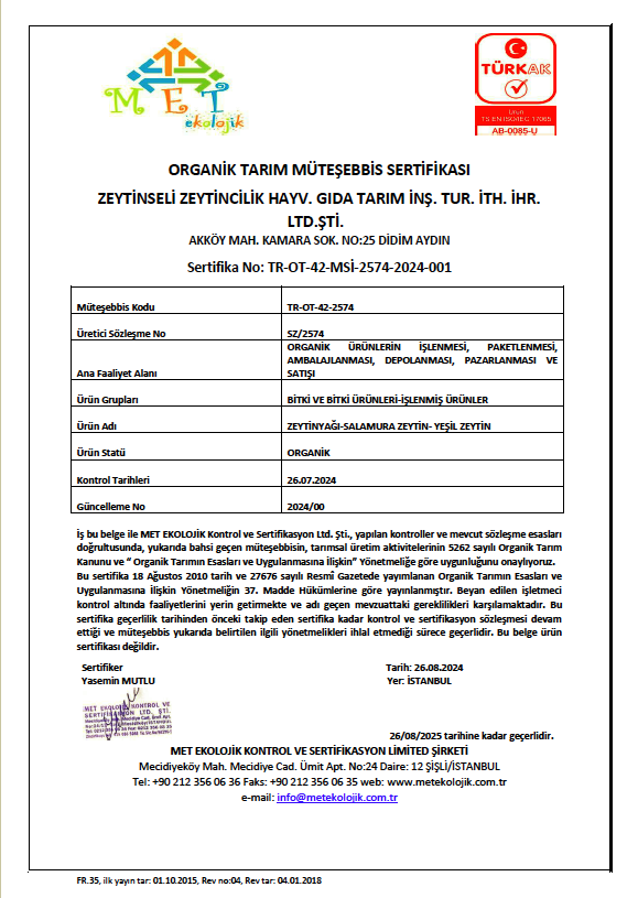 Organik sertifikalı Gemlik zeytinimiz, hiçbir katkı maddesi içermeden doğal lezzetiyle sofranıza Ege'nin organik bereketini getiriyor.